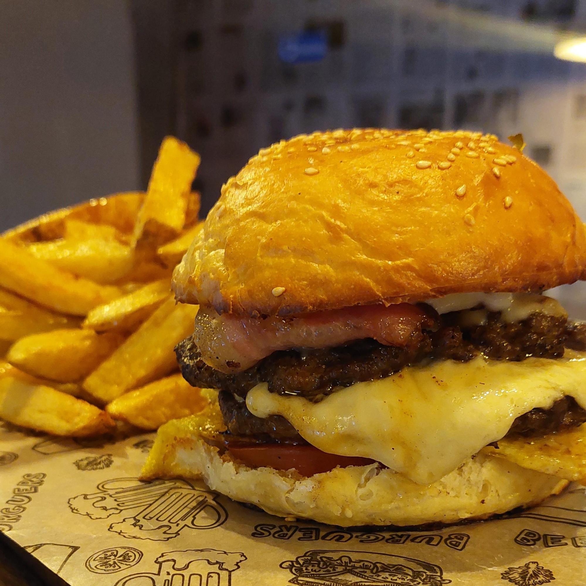 Pan artesanal, doble medallon de carne, queso, bacon, tomate, cebolla caramelizada
