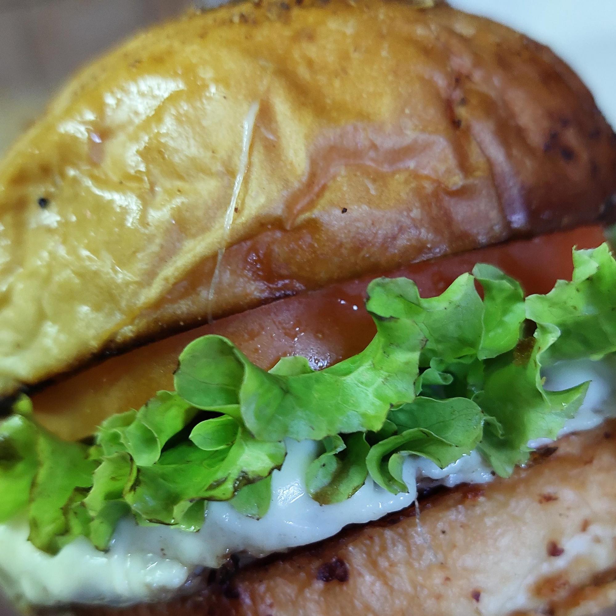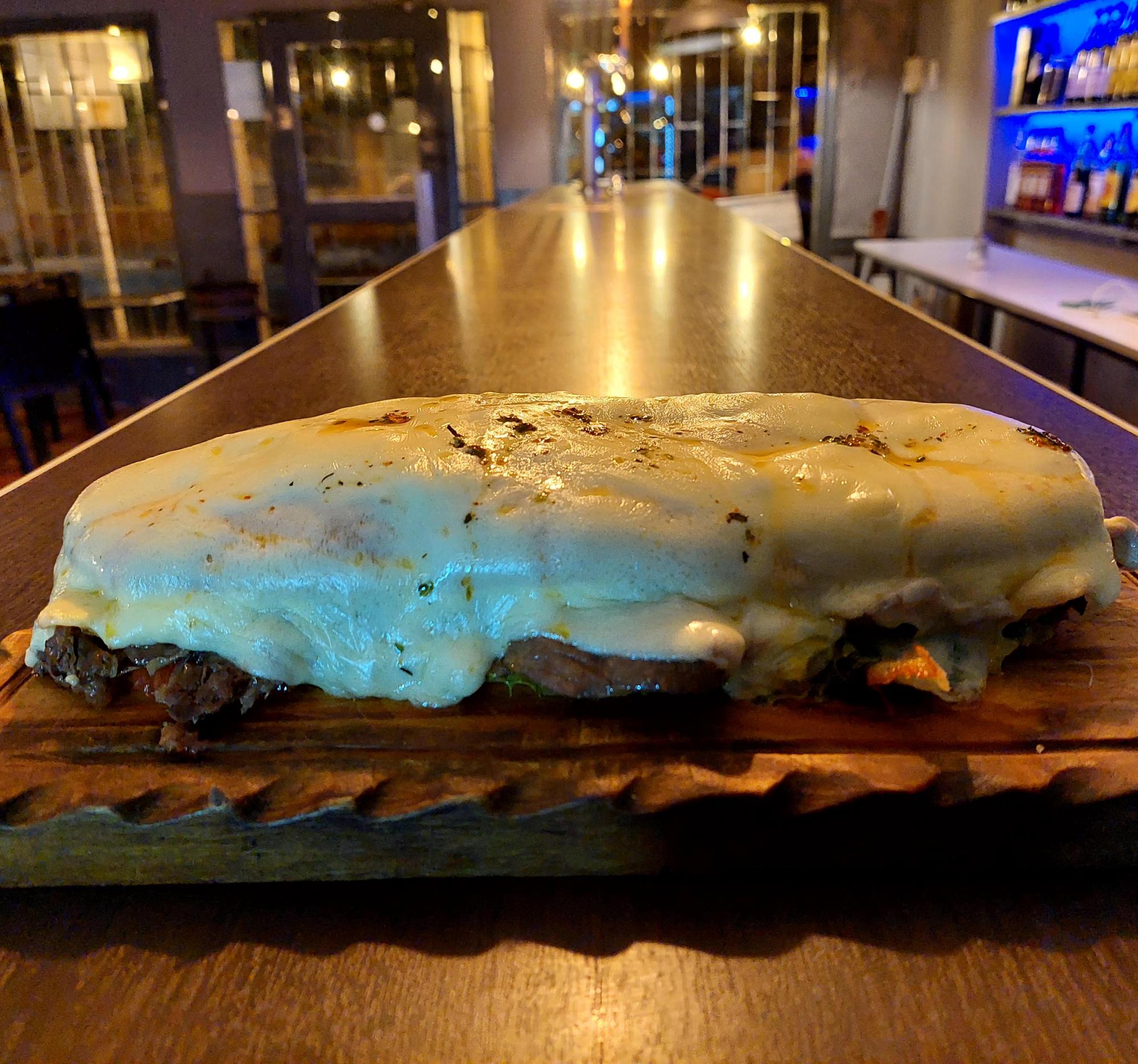 Pan artesanal, carne, queso y ketchup