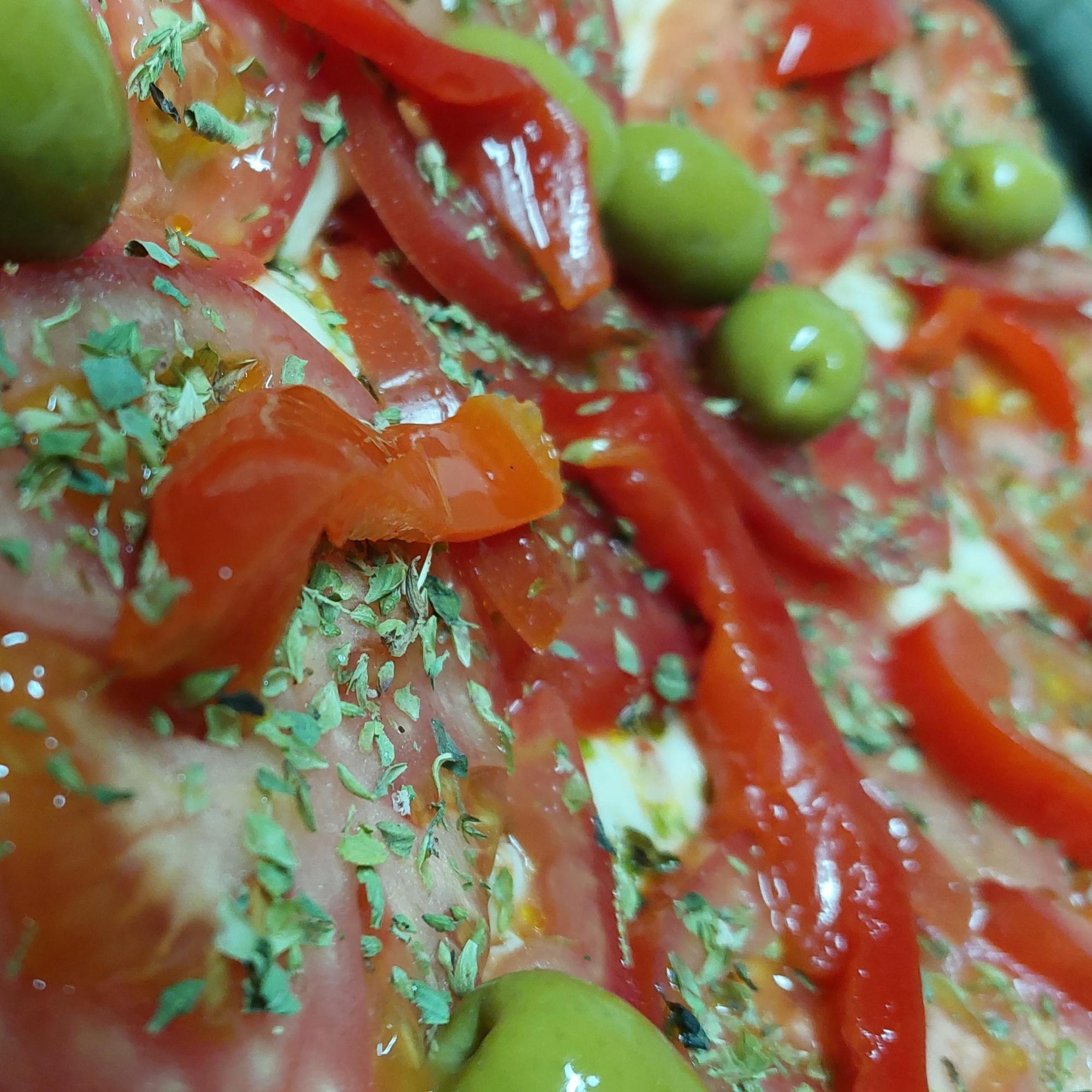 Morrones, aceitunas, rodajas de tomate fresco, orégano