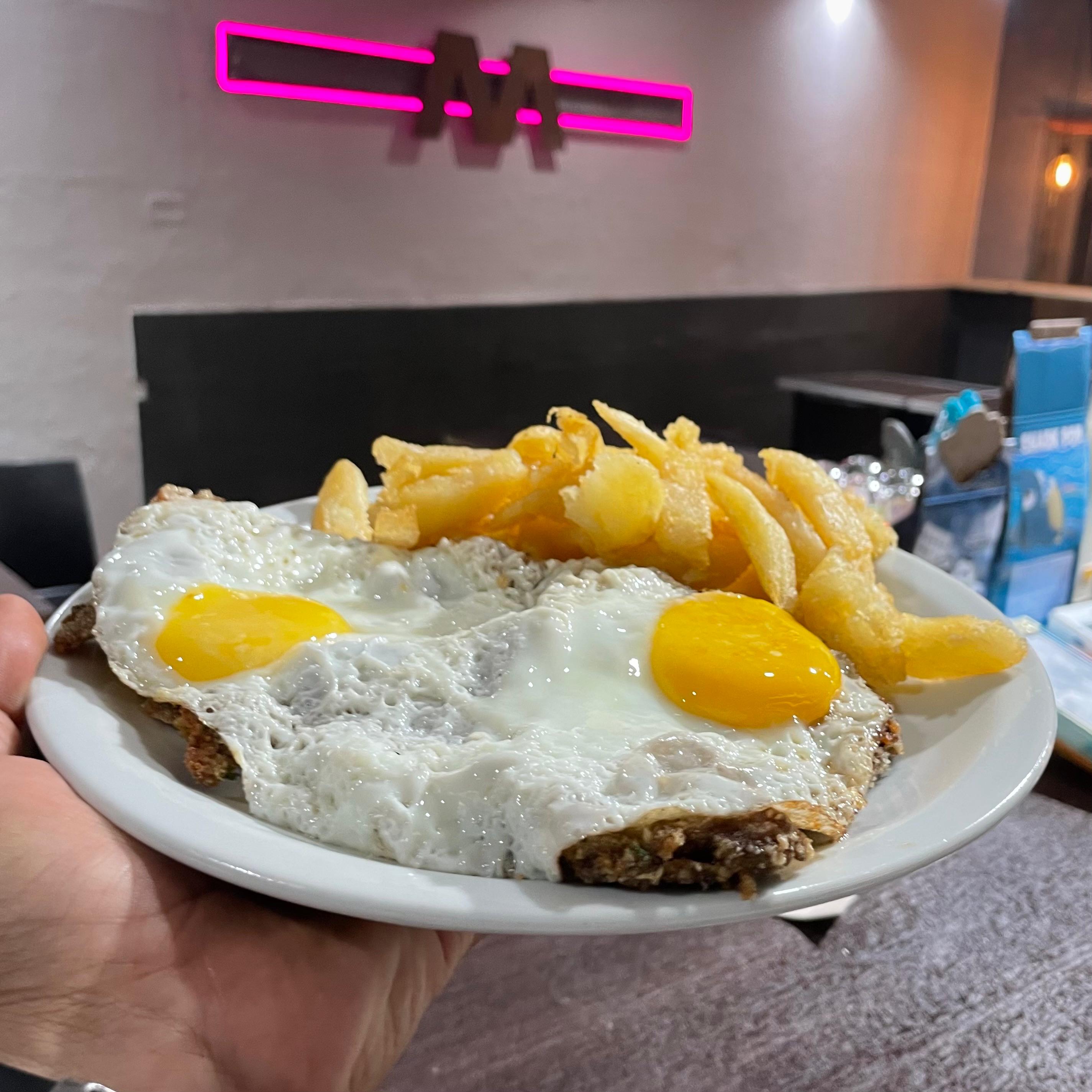Pan Artesanal, doble medallón de carne, queso,bacon, tomate, ketchup y huevo