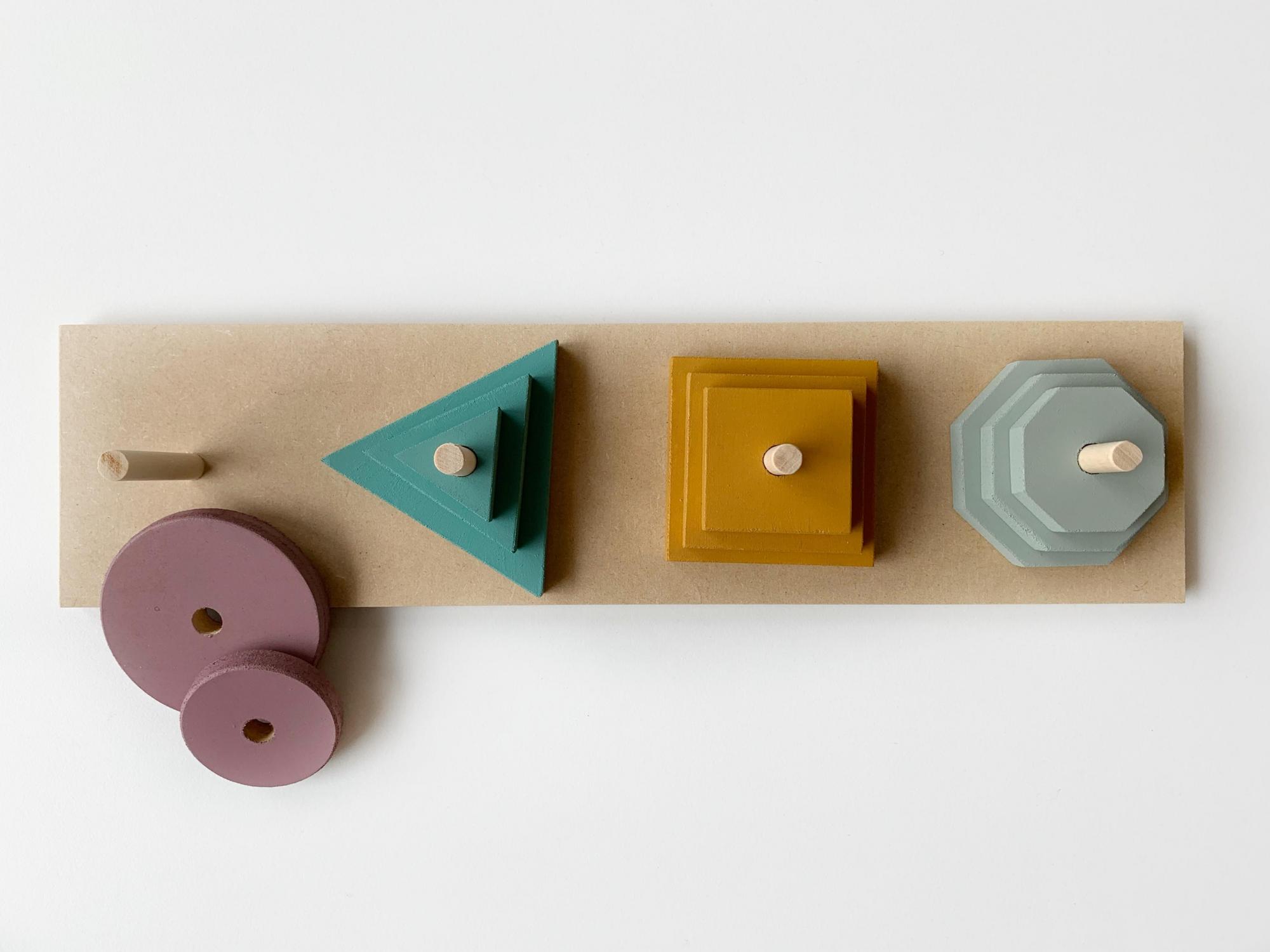 12 piezas geométricas de 3 medidas para encastrar de mdf + base de mdf. Piezas lijadas y pintadas a mano. - PRODUCTO A PEDIDO