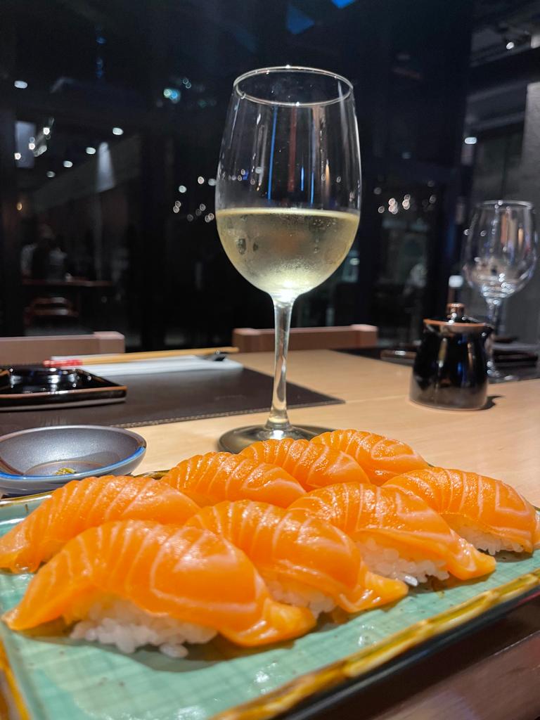 8 Nigiris skin de salmón y palta finalizada en salsa teriyaki.