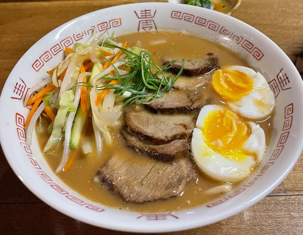 Salteado de verdura, caldo de miso, panceta, huevo, choclo y fideos. 味噌拉面 味噌汤底,内有蔬菜,日式叉烧,日式卤蛋,海苔及拉面