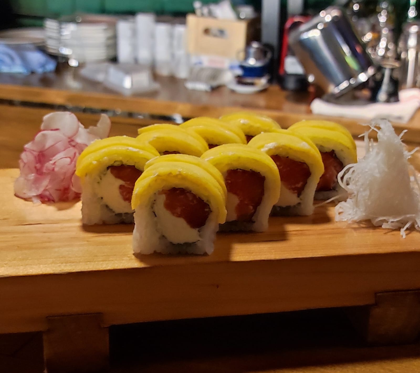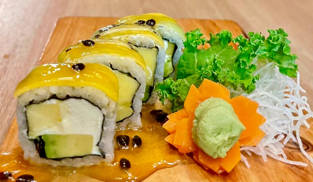 Maki de salmón empanado y coronado con philadelphia, mango flambeado, finalizado con salsa maracuyá