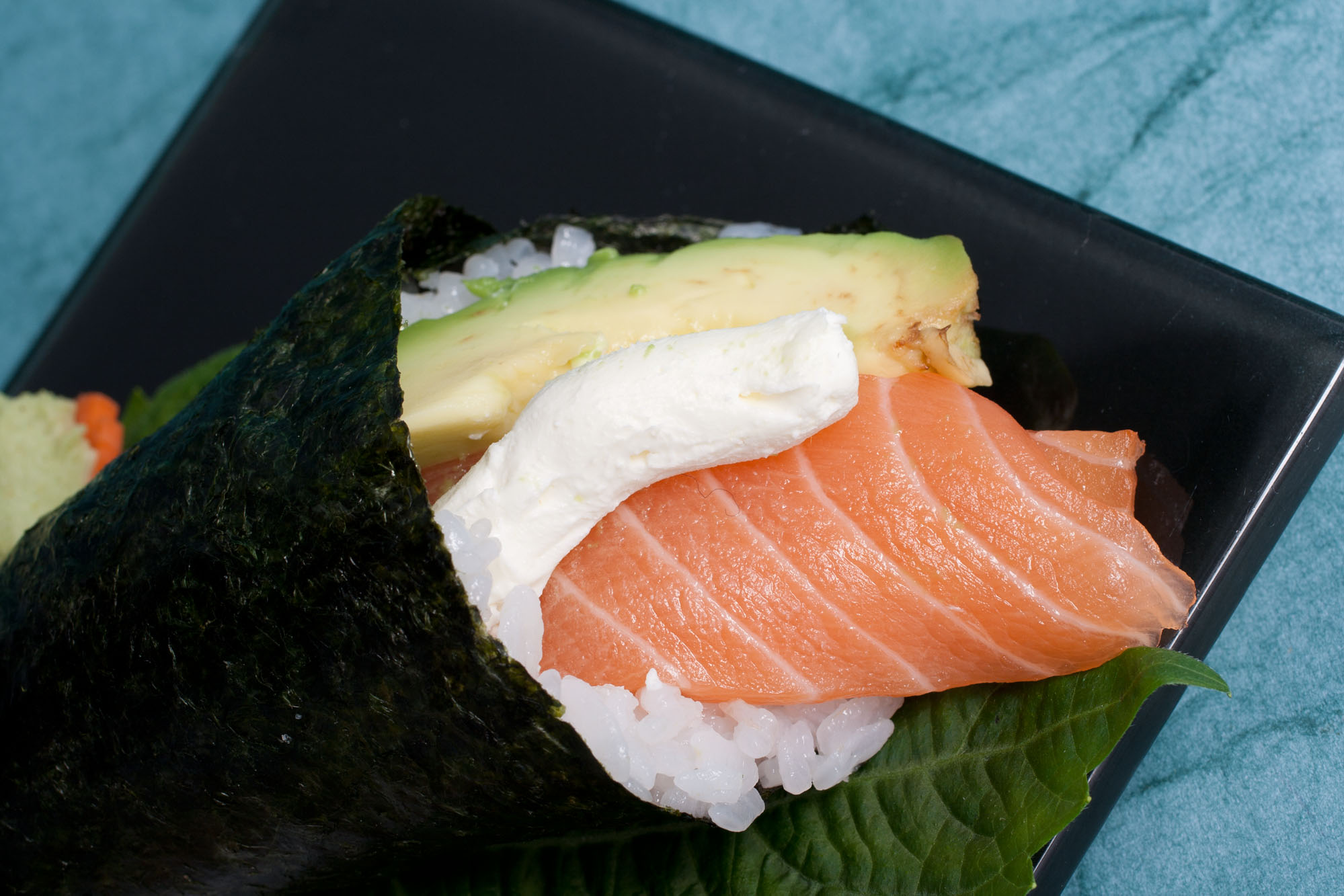 Cono de alga nori relleno de salmón, queso y palta. 手卷 三文鱼,费城芝士酱及牛油果的寿司筒
