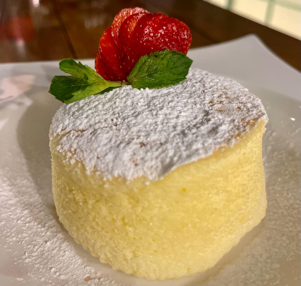 Mousse de matcha y chocolate blanco sobre bizcochuelo de vainilla.