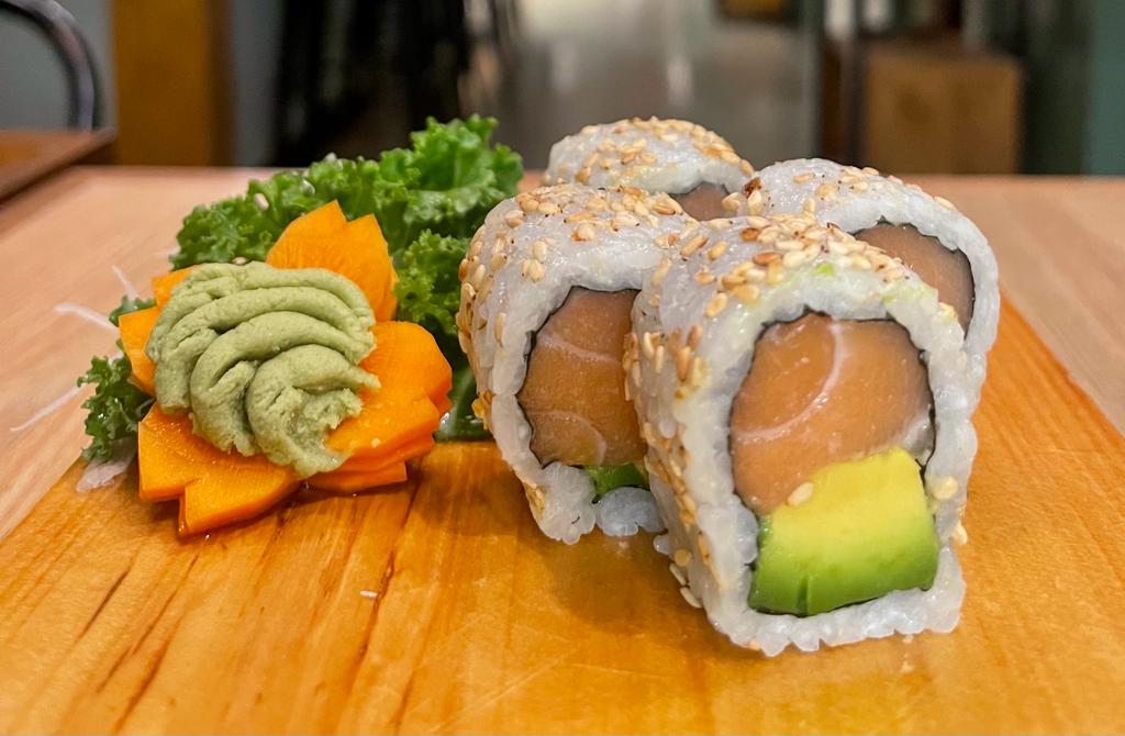 Roll calentito sin arroz, con alga nori, salmón, queso philadelphia y palta.