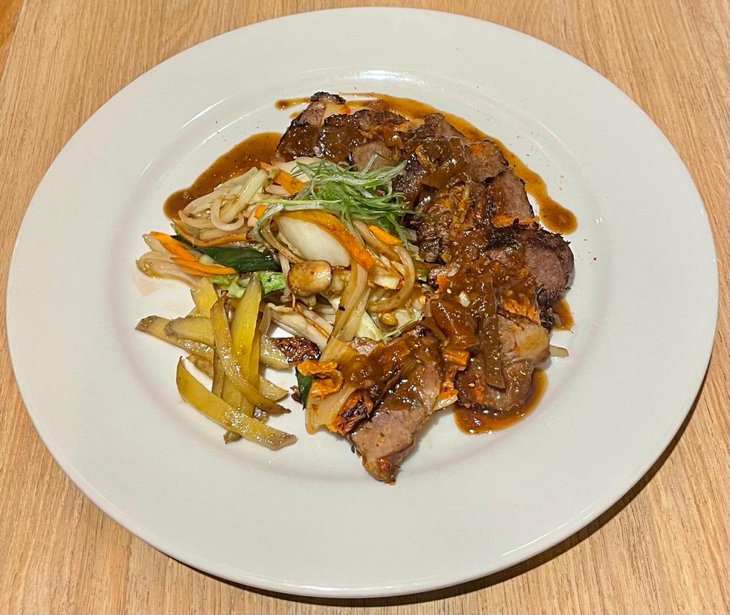 Lonjas de bondiola salteado al wok, condimentado en especias orientales, acompañado con ensalada y gohan. 姜汁烧肉 姜汁烧肉搭配沙拉和米饭