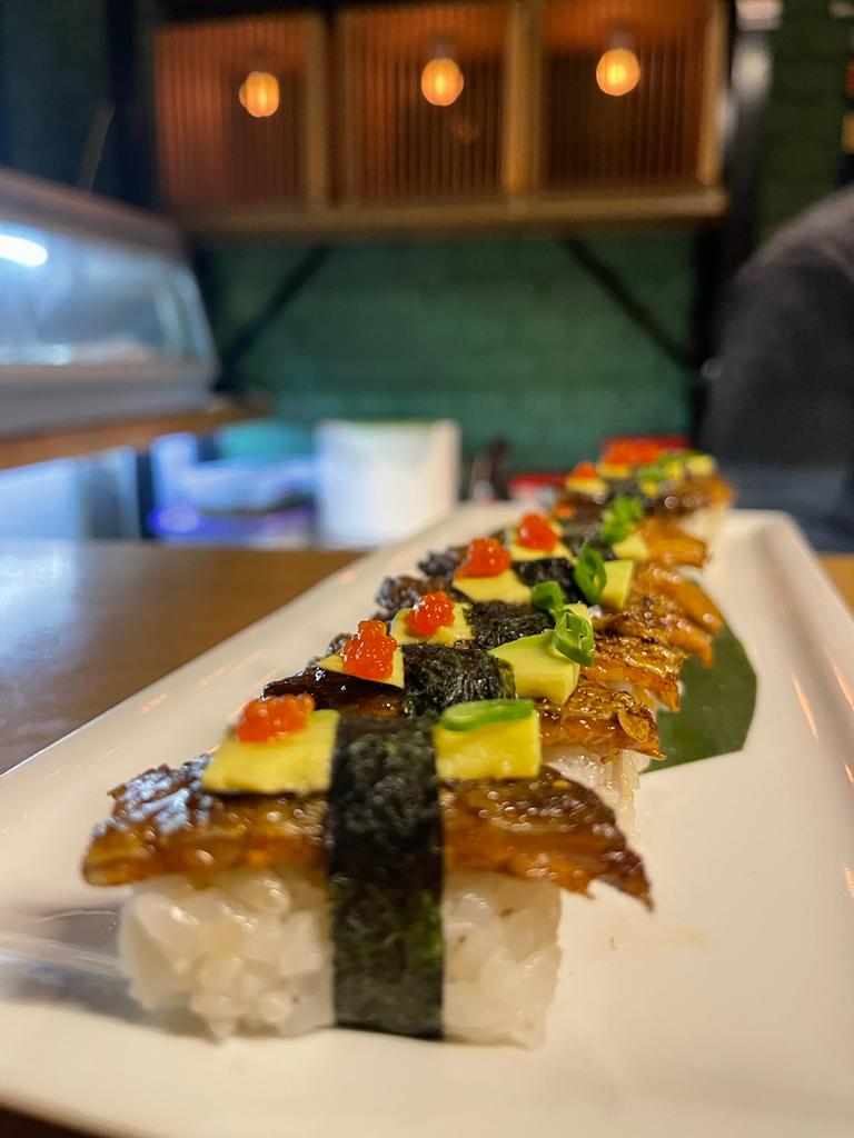 8 Nigiris skin de salmón y palta finalizada en salsa teriyaki. 鱼皮握寿司 8件覆盖照烧汁的三文鱼皮及牛油果握寿司